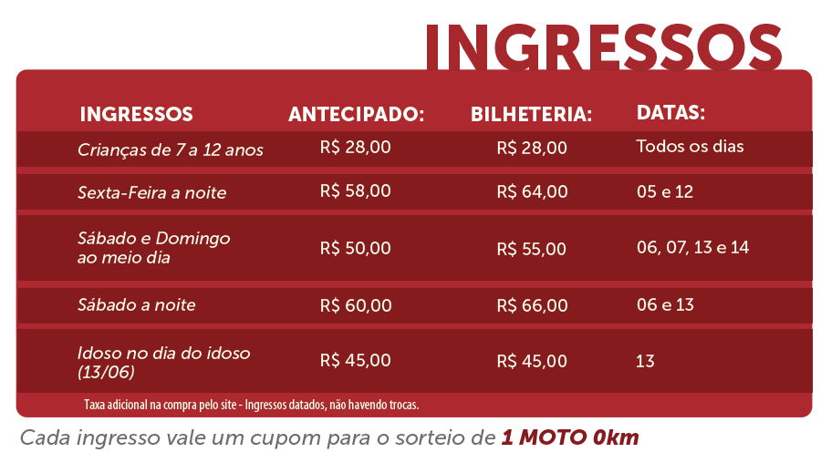 Em Encantado, os ingressos podem ser adquiridos na Associação Comercial e Industrial de Encantado (ACI-E) e na Loja Beneduzi. A Suinofest será realizada nos dias 05, 06, 07, 12, 13 e 14 de junho, no Parque João Batista Marchese, em Encantado.